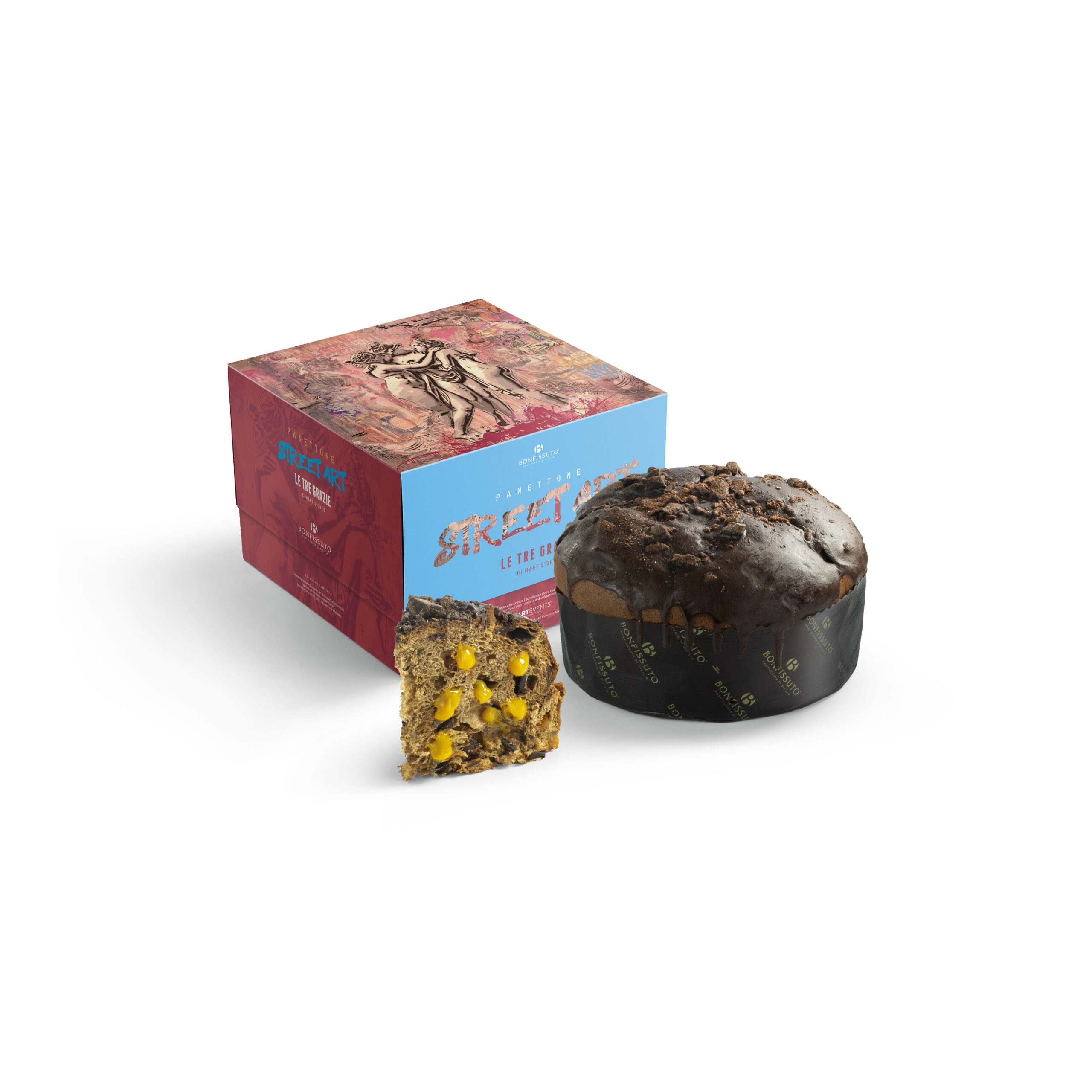 Xειροποίητο πανετόνε με φυσικό προζύμι. Επικάλυψη μαύρης σοκολάτας με γέμιση κρέμας marsala και zabaglione. Διατηρείται μέσα στο δημιουργικό κουτί από το έργο που δημιούργησε η Mart Signed.