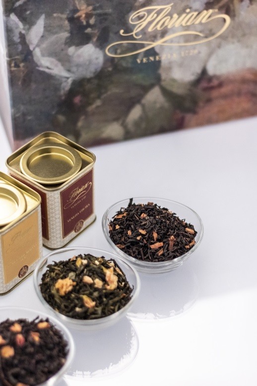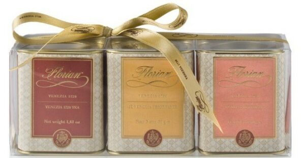Το σετ τριών επιλεγμένων τσαγιών σε μικρά τενεκεδάκια είναι μια απολαυστική συλλογή, χαρακτηρίζονται από υπέροχα αρώματα και αποτελούνται από μαύρο και πράσινο τσάι με λουλουδάτα και πικάντικα αρώματα. Ο συνδυασμός αυτών των διαφορετικών μειγμάτων τσαγιού έχει σχεδιαστεί για να ικανοποιήσει τα γούστα όλων των πελατών μας και να γευτεί μια αληθινή εμπειρία Florian ακόμα και στο σπίτι, θυμίζοντας το παρελθόν της Βενετίας που φτιάχτηκε από το εμπόριο μπαχαρικών, αρωμάτων και πολύτιμων υφασμάτων.